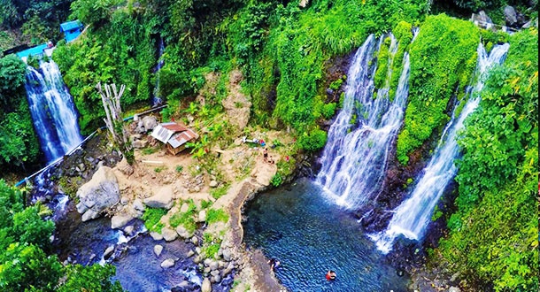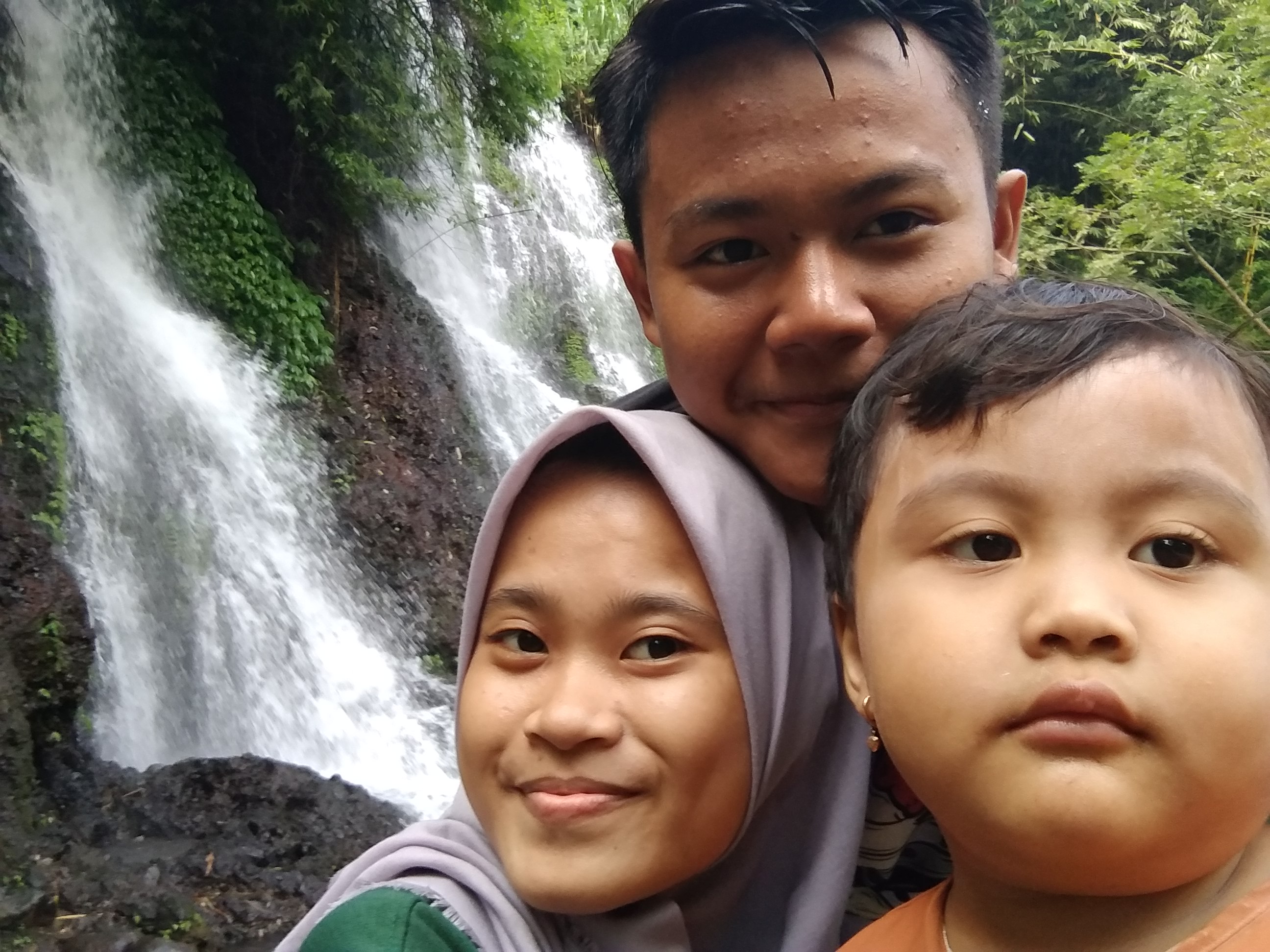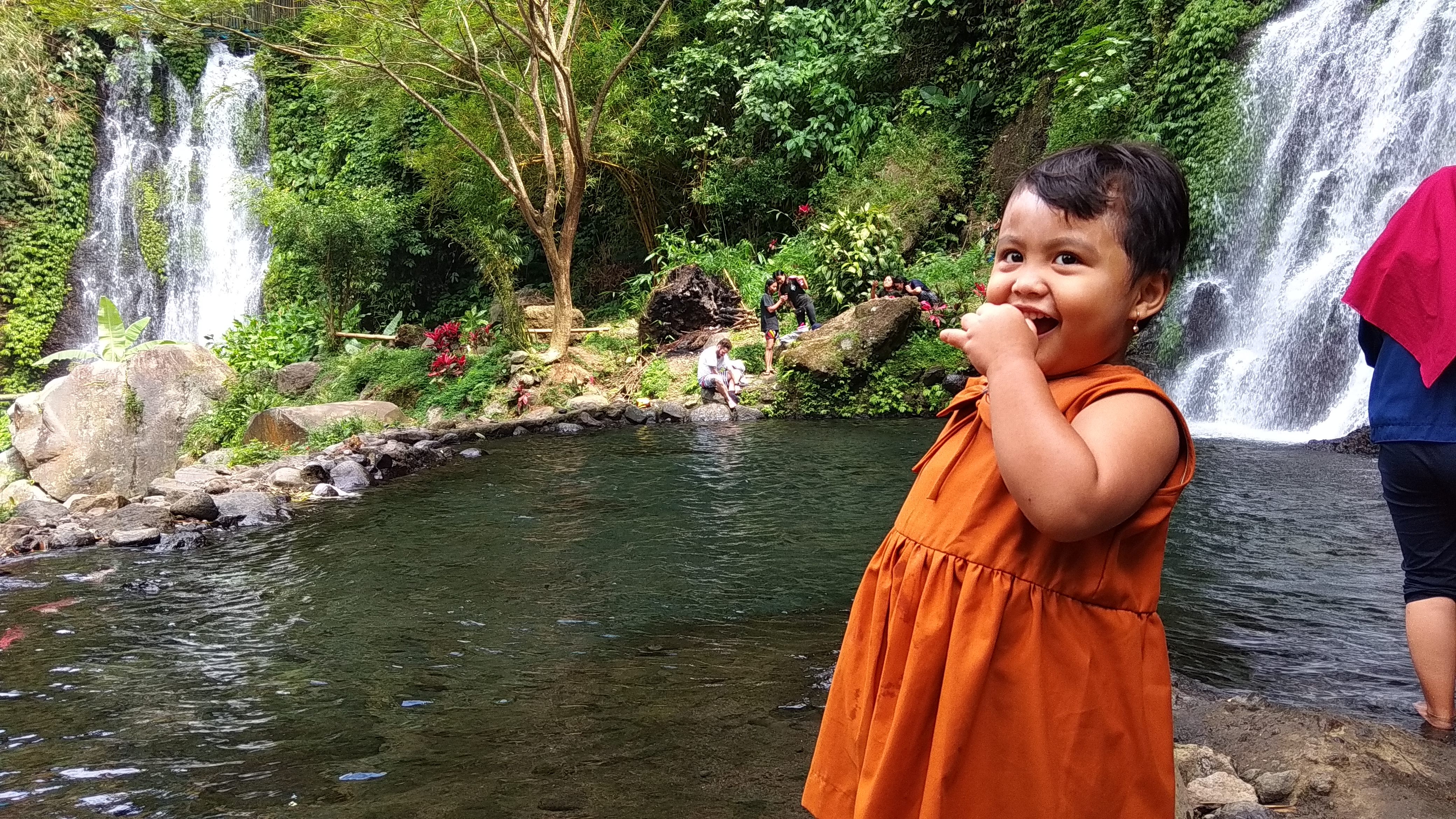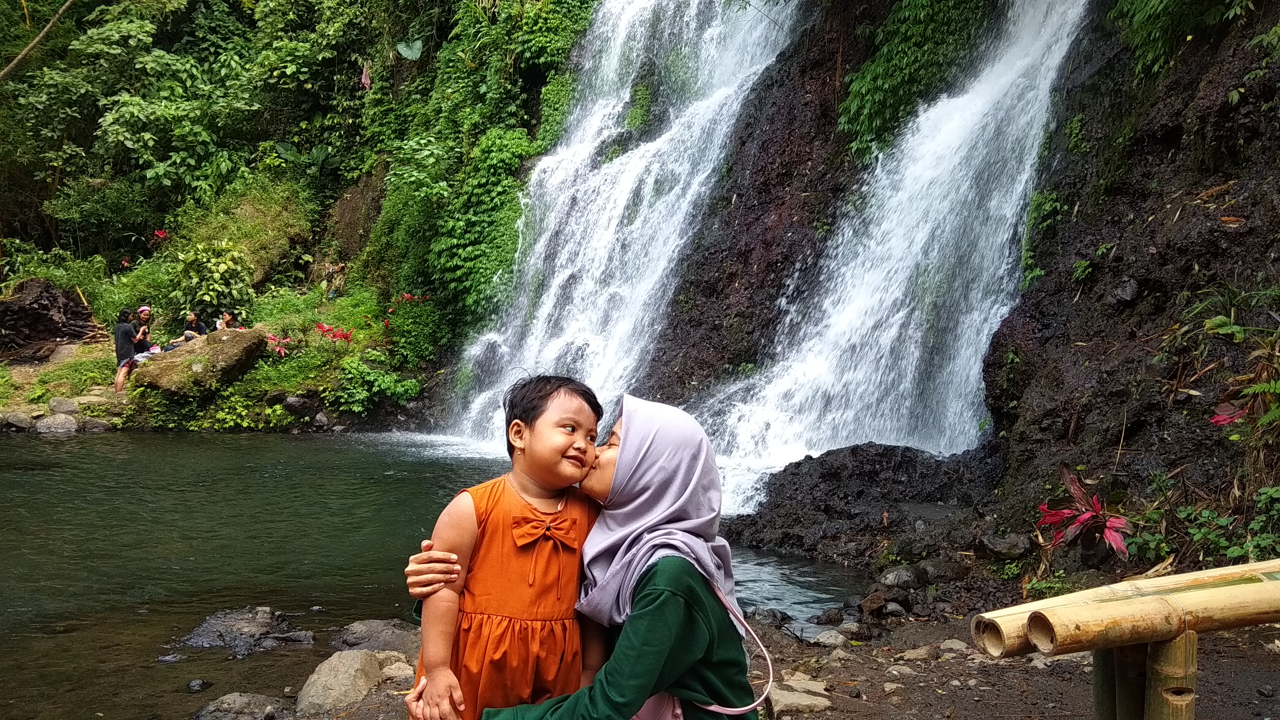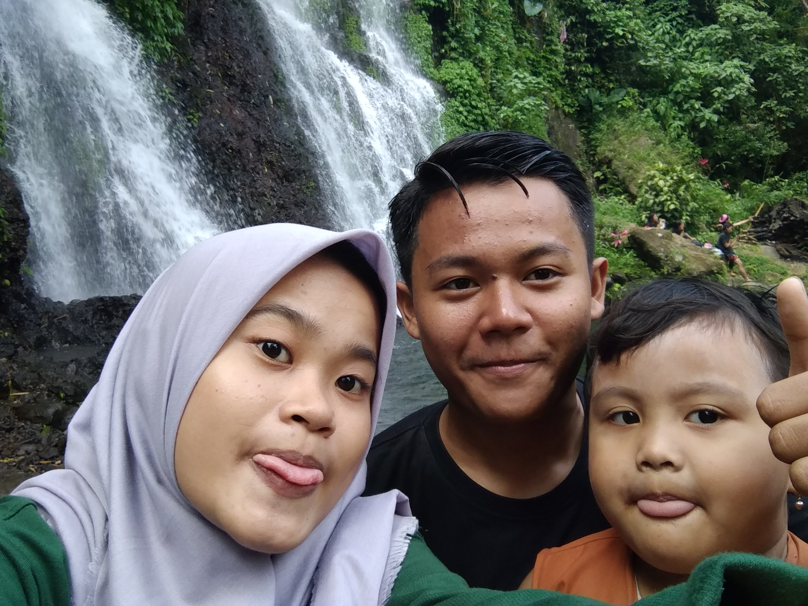 segarnya udara dan air menyambut kedatangan kita. Sejenak aku terdiam untuk menghirup udara dalam dalam, rasa segar dan bersihnya udara terasa nyaman di dada. Di depan mata telah terpampang nyata air terjun yang tidak begitu tinggi tapi cukup indah karena terdiri tidak hanya satu air terjun saja melainkan ada 3 air terjun sekaligus yang berasal bukan dari aliran sungai melainkan langsung dari sumber mata air.