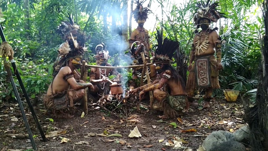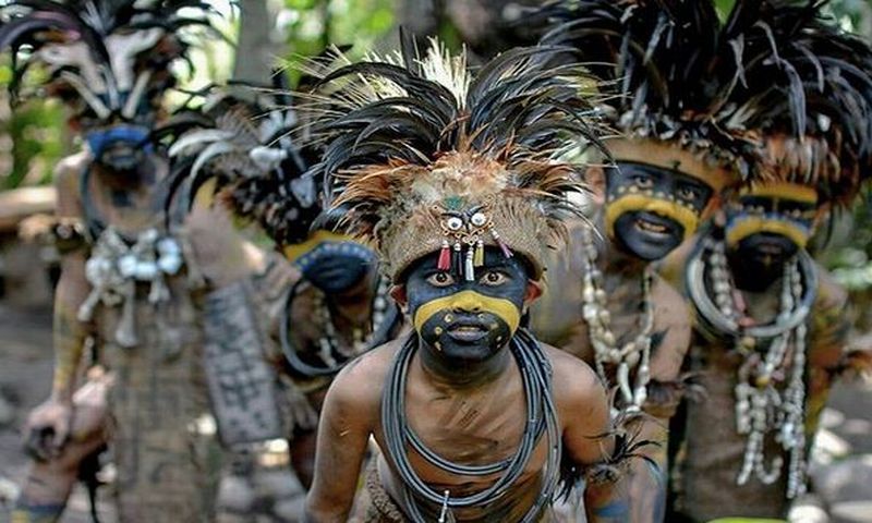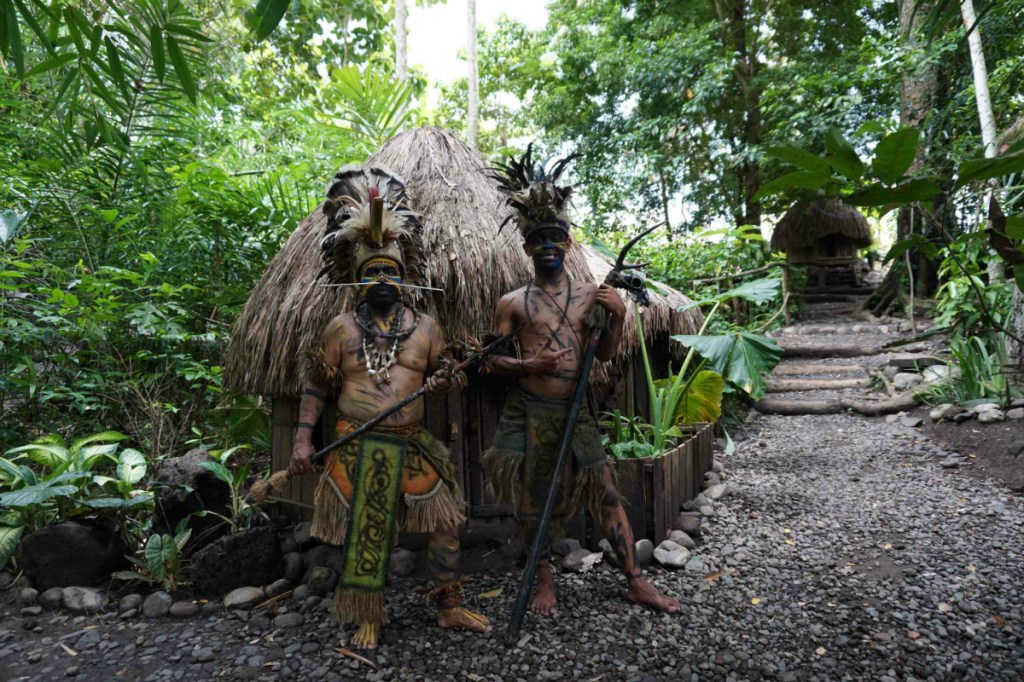 Dengan mengenakan baju ala Suku Dayak dan wajah yang digambar sesuai dengan adat suku pedalaman, serta ditambah lagi aksesoris penutup kepala dan koteka seakan membuat wisatawan berada di kawasan pedalaman yang sangat primitif.